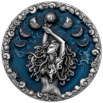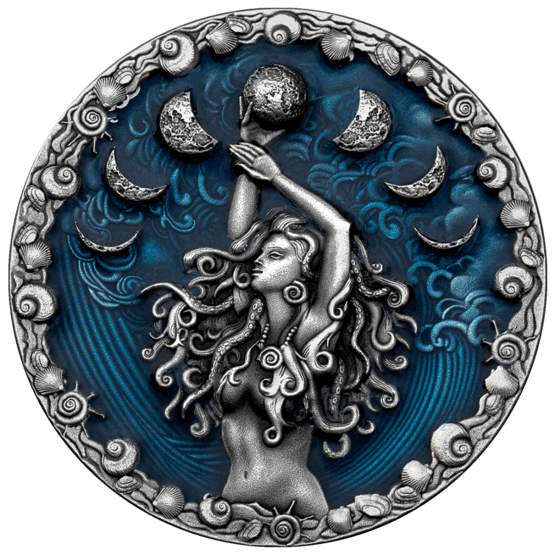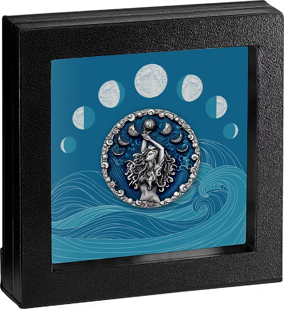 Struck in 62.2 g of .999 silver, the 45 mm surface becomes a stage for intricate detailing: shells woven around the border, flowing hair that mirrors ocean currents, and the lunar arc positioned above her as a symbol of cycles, guidance, and transformation. The antique finish softens each contour, giving the piece the refined tactility of an ancient artefact shaped by time.